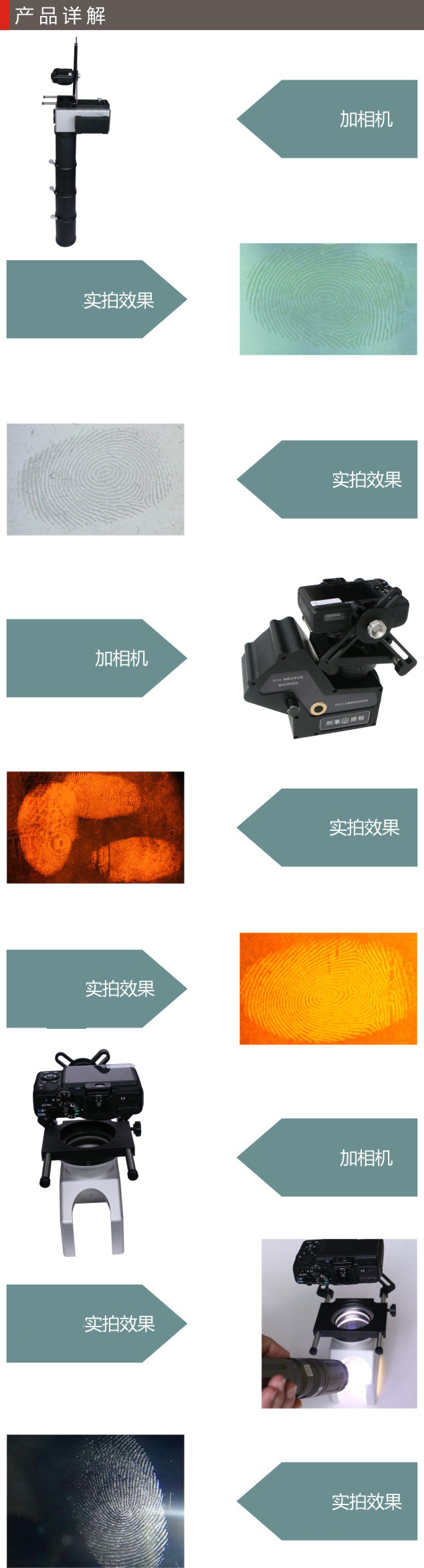 產品分為三大類,集垂直定向反射拍照、暗視野拍照、顯現指紋拍照方式于一體;專業提取汗液、油脂、灰塵、粉末、血跡等指掌紋;光源亮度可調、距離可調、角度可調,適用于非滲透性光滑表面客體,專業指紋轉移膠配合暗視野拍照系統使用可對相對粗糙的客體表面進行指紋轉移后無損提取,原客體表面可繼續使用粉末顯現。整體套裝,攜帶方便,野外和實驗室均可使用。是對提取多類現場指紋的一種創新。
